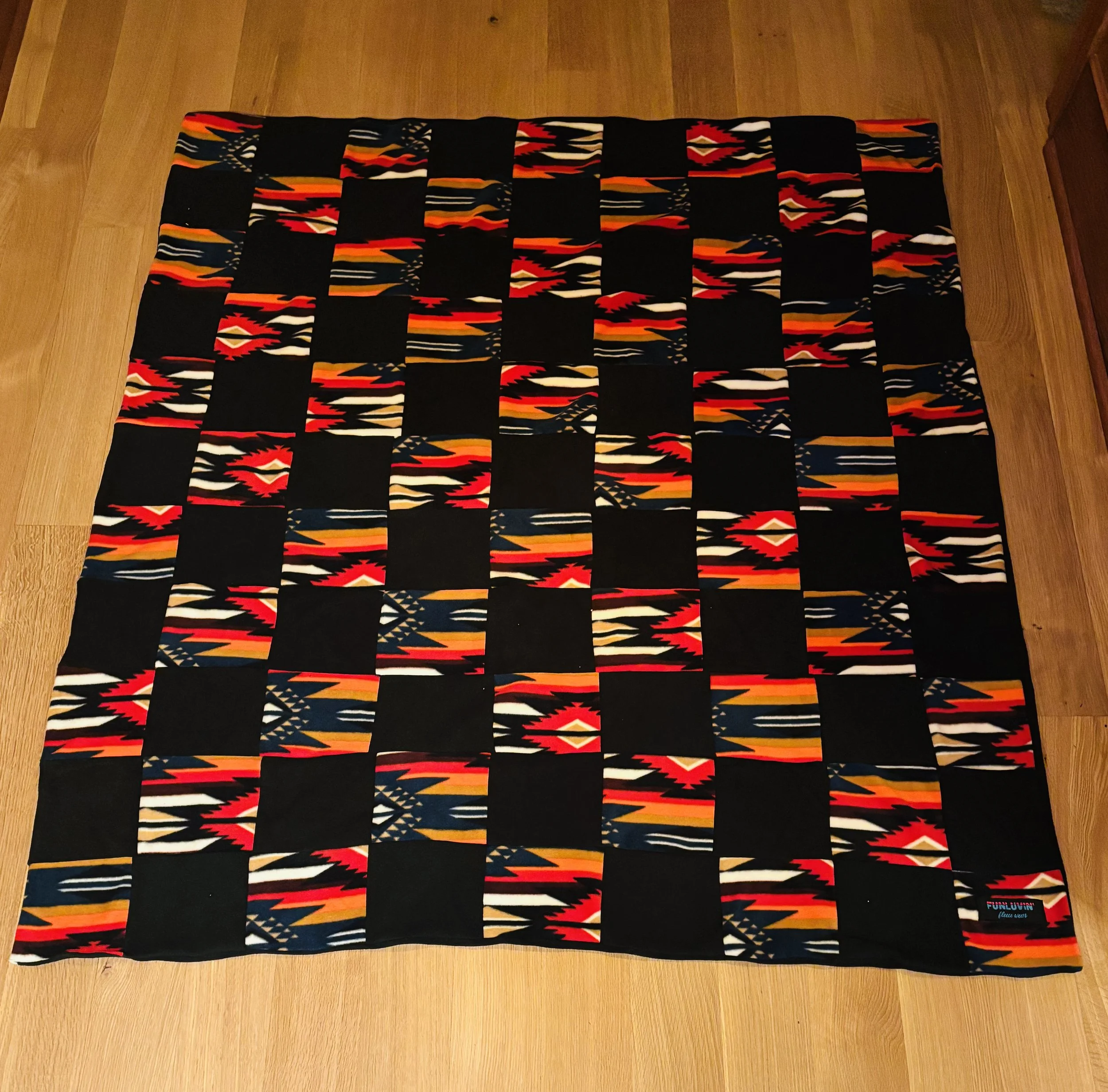 This “Coffee Talk” one-of-a-kind fleece blanket is a mixture of our New Firestone Southwest inspired pattern and Navy fleece fabrics. One side is blocks of recycled fabric squares and the other is a solid fabric in navy.